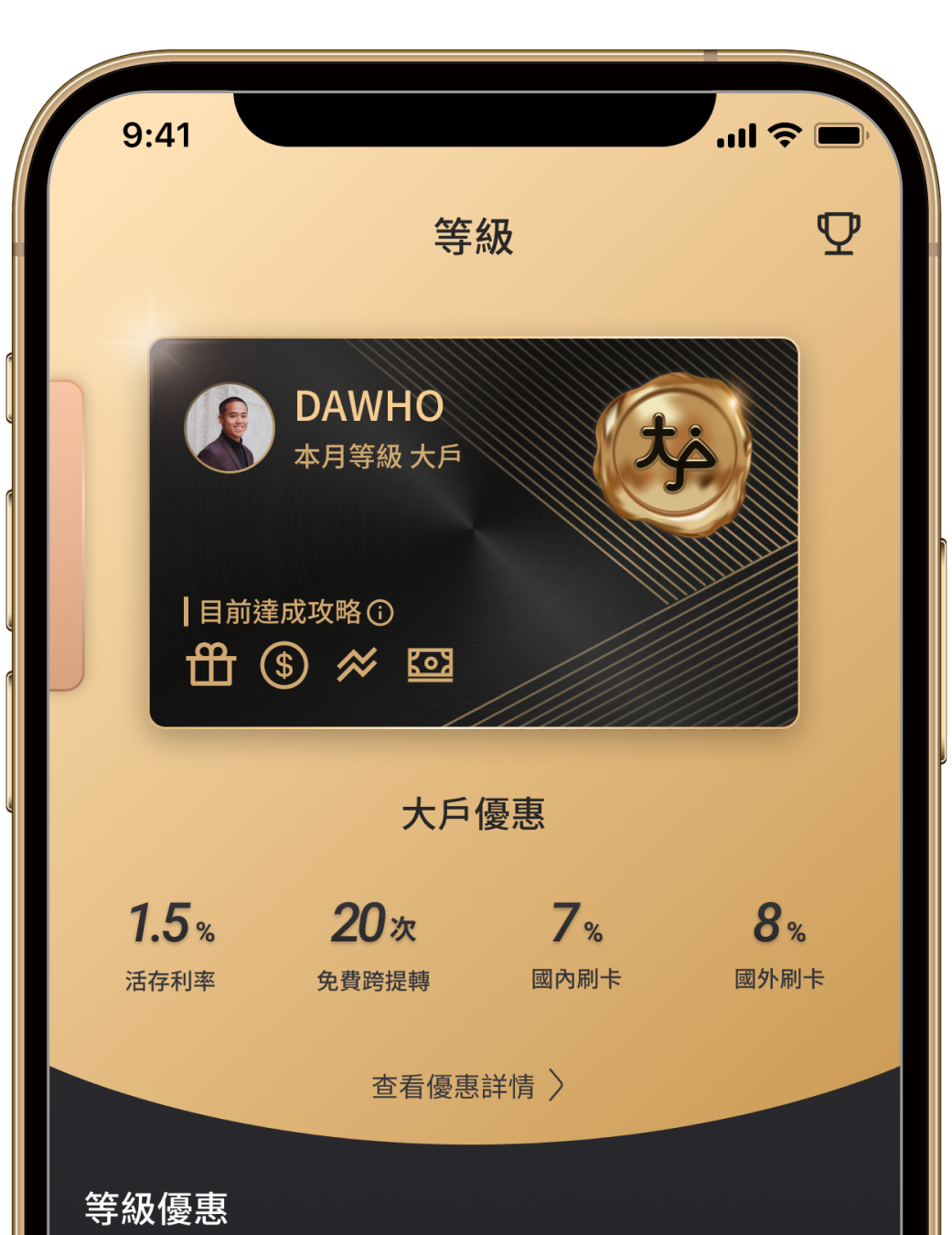 可以登入DAWHO APP,透過下列路徑查詢當月等級與優惠喔!
