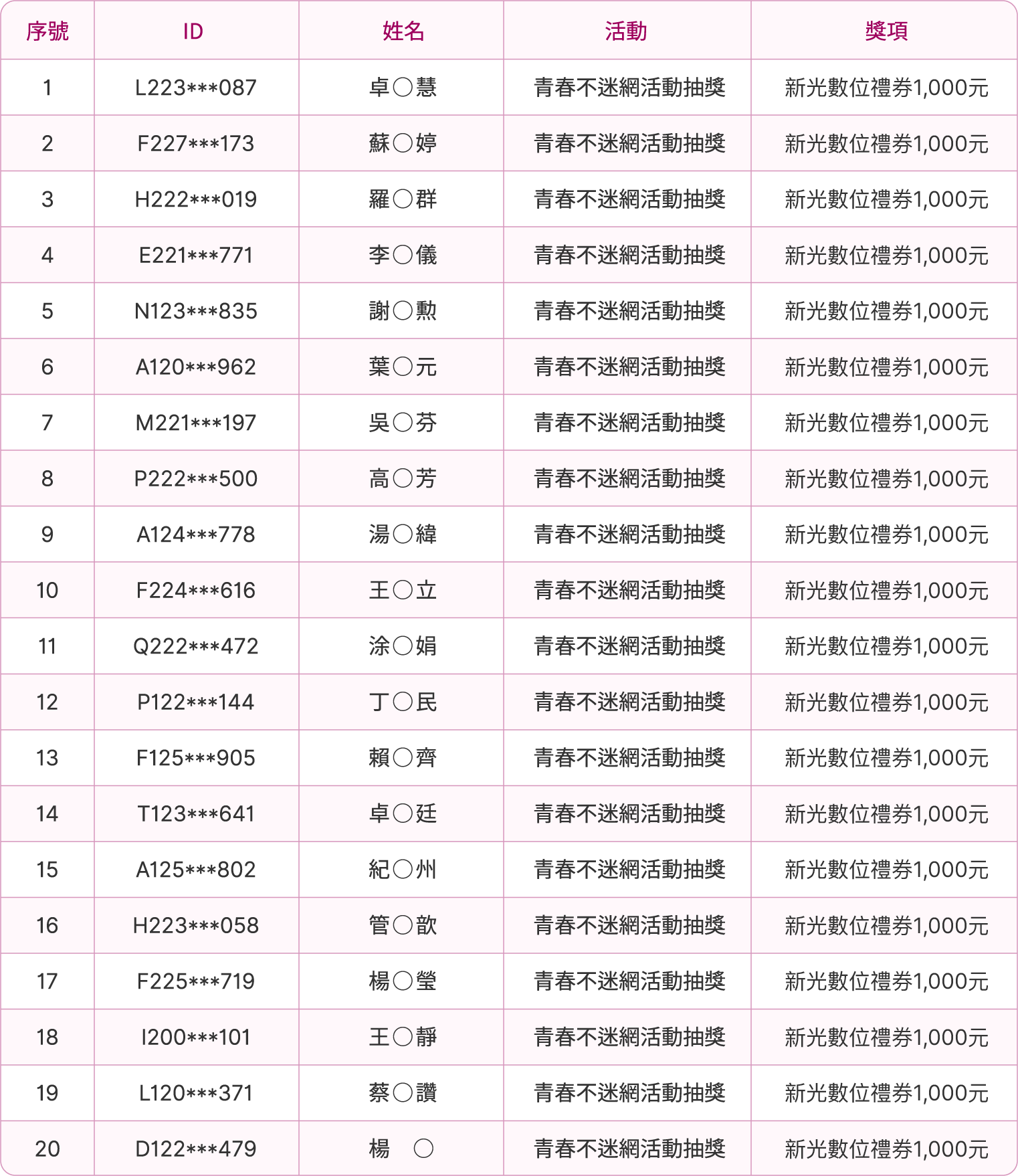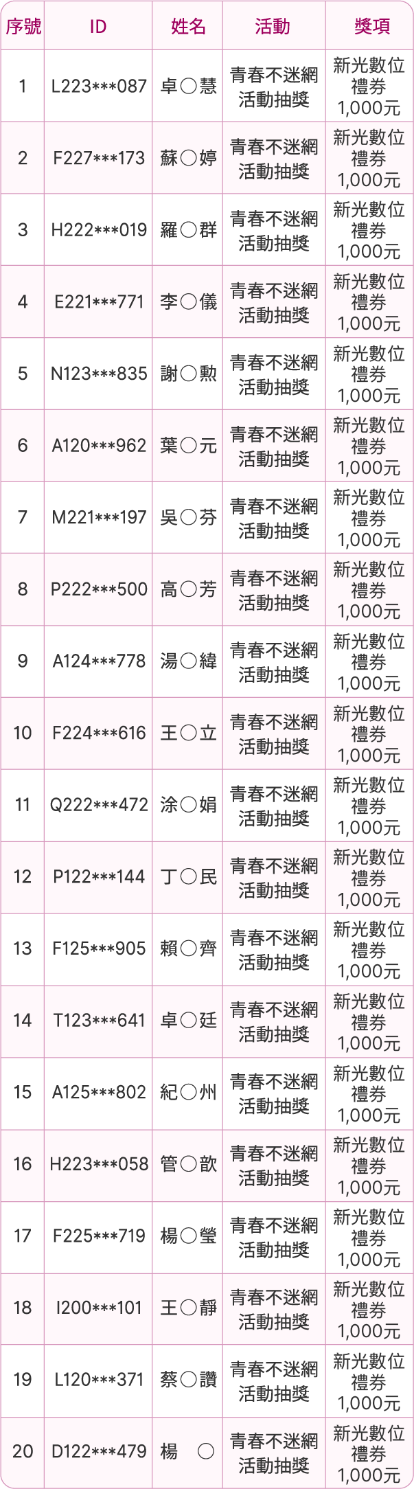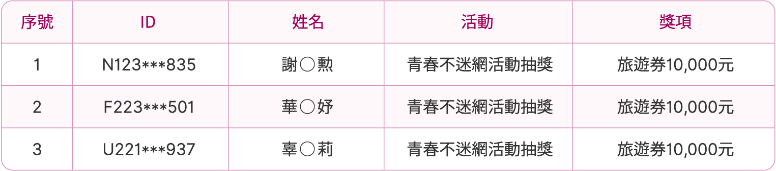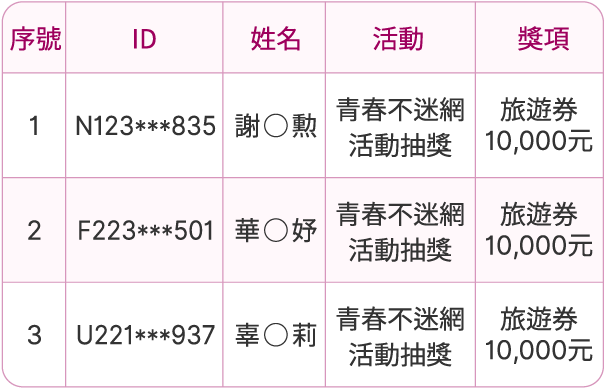「好禮二 國外旅遊折抵金新臺幣10,000元(3名)」中獎名單